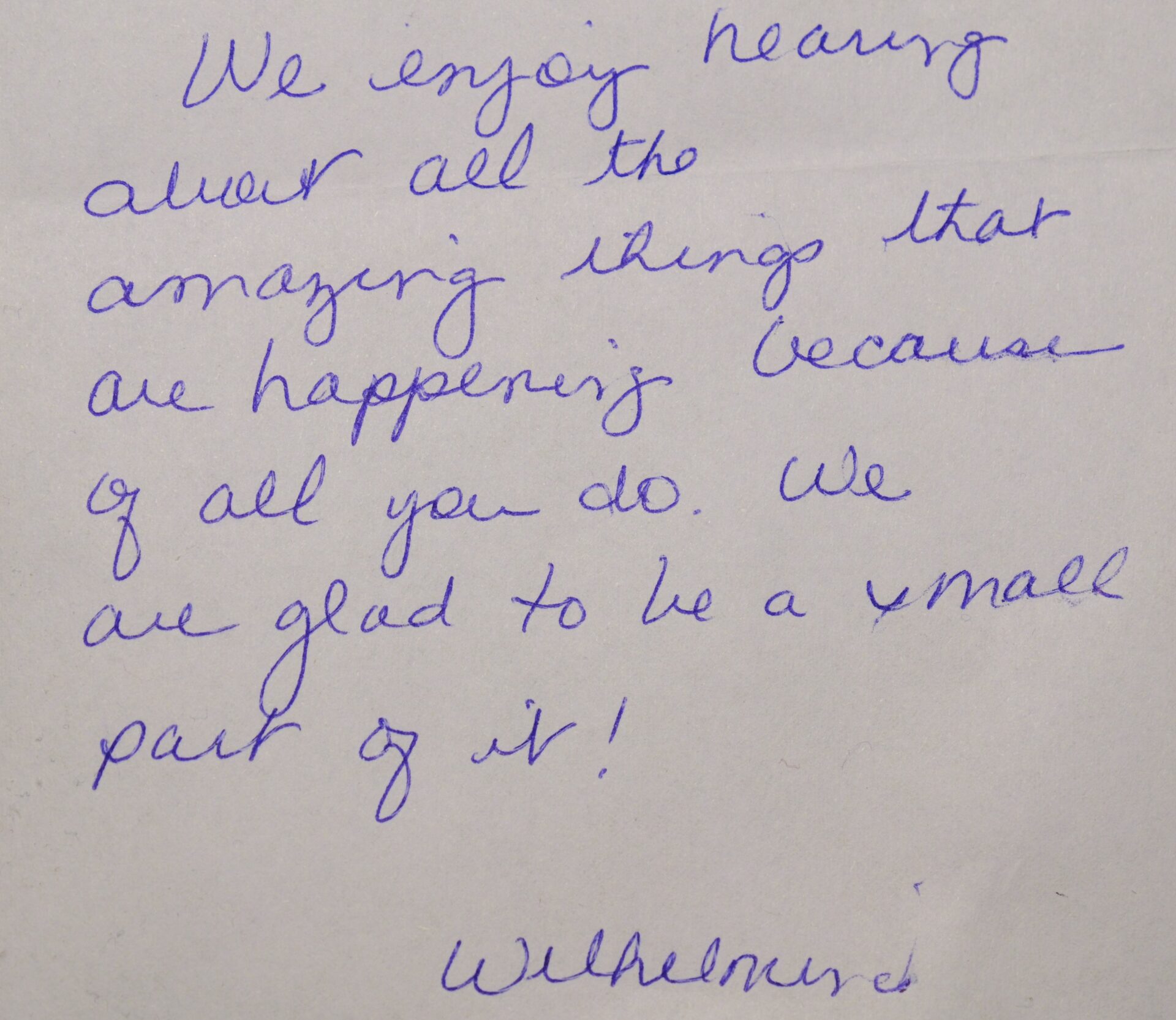 “We enjoy hearing about all the amazing things that are happening because of all you do. We are glad to be a small part of it!”